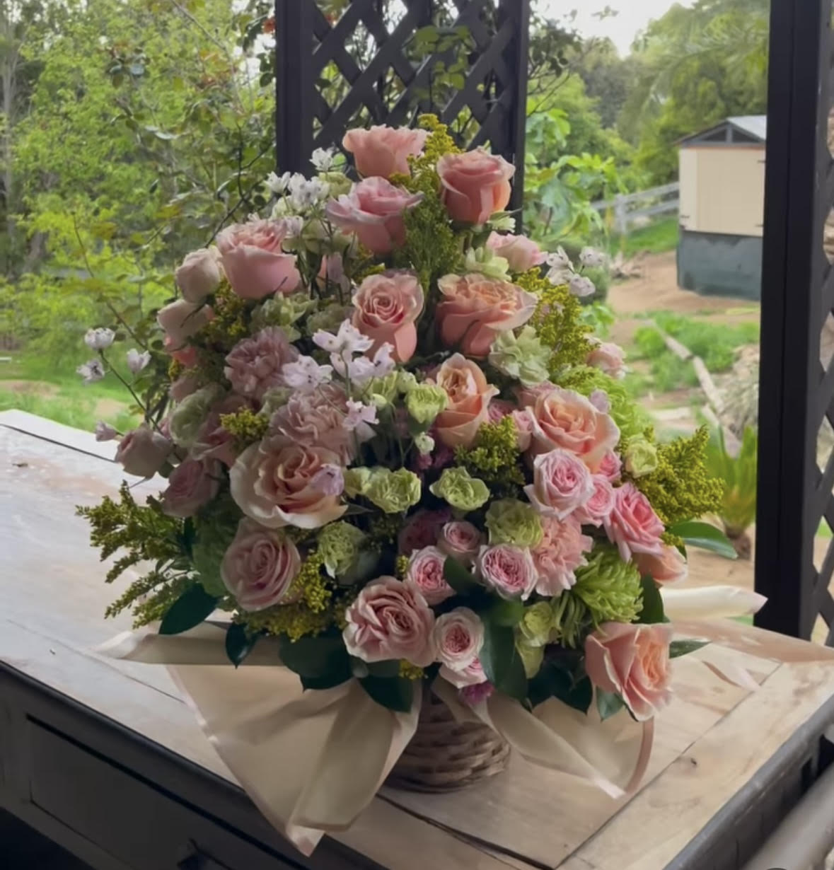 Step into a fairytale with our Blushing Garden — a breathtaking arrangement overflowing with soft blush roses, green carnations, pale pink spray roses, and delicate seasonal blooms. Designed in a natural woven basket and wrapped with elegant cream ribbon, this bouquet brings timeless romance and sophistication to any setting. Ideal for weddings, anniversaries, or grand gestures.