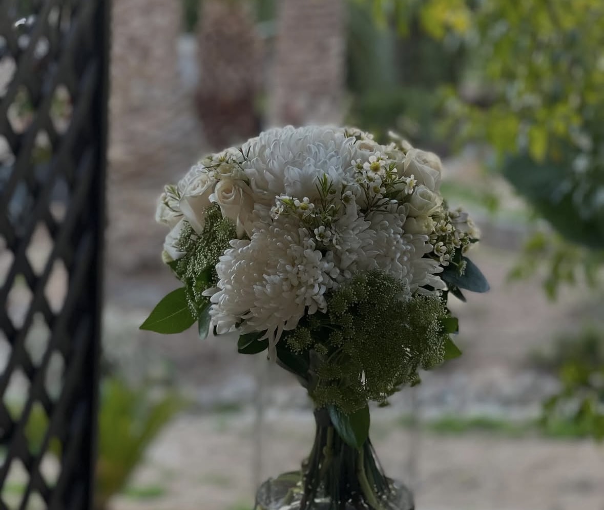 An elegant and serene bouquet of white roses, chrysanthemums and baby’s breath. A timeless piece for sympathy, weddings or minimalist decor. Vase subject to change.